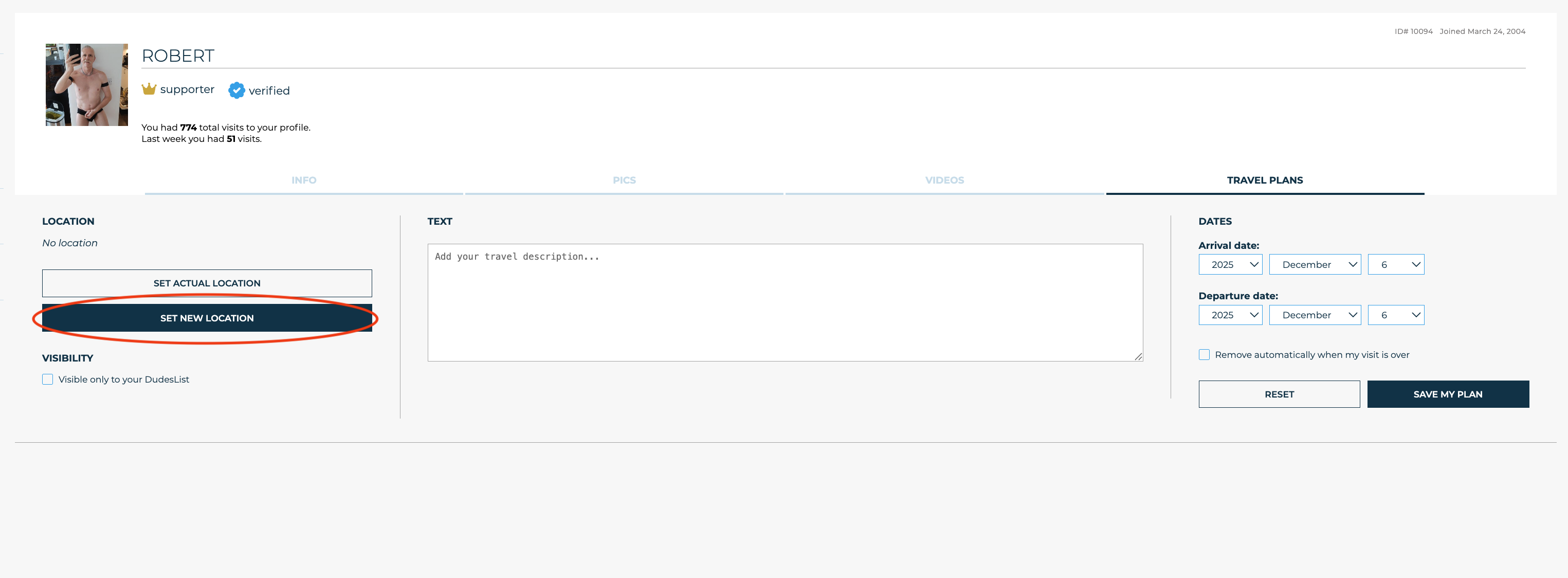 To add your travel plans, first click travel in the main menu https://chat.dudesnude.com/members/travel Initially you will be shown guys travelling to the location currently shown on your profile. You can change the view from 'grid' (more compact) to 'list' (more info) by clicking these icons at the top