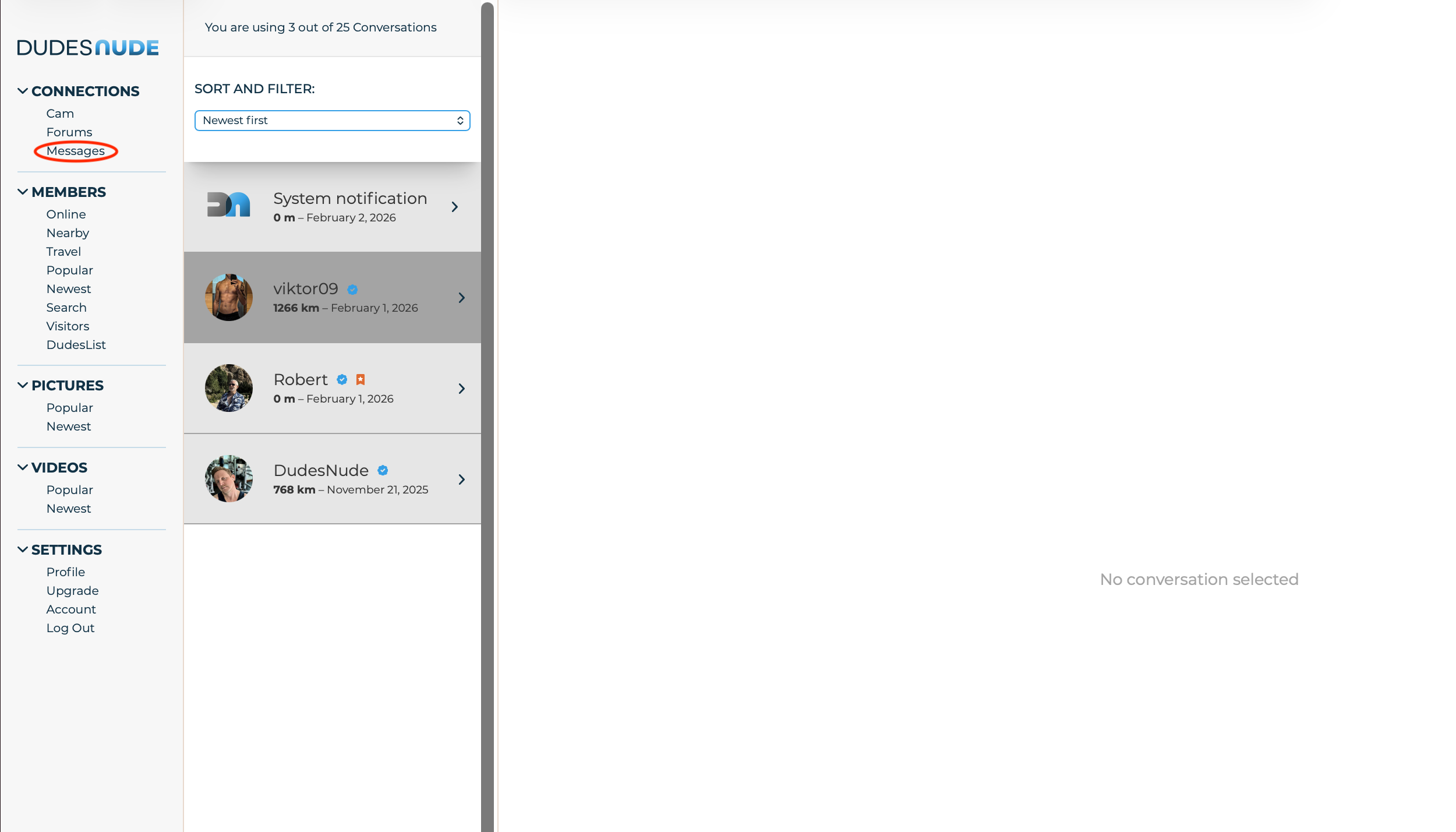 If you don't see the option for messages in the main menu, you only have partial access. Your profile isn't approved yet. This rarely takes more than 24 hours, but can take up to 72. If you have lost access for more than 72 hours, please email support@dudesnude.com